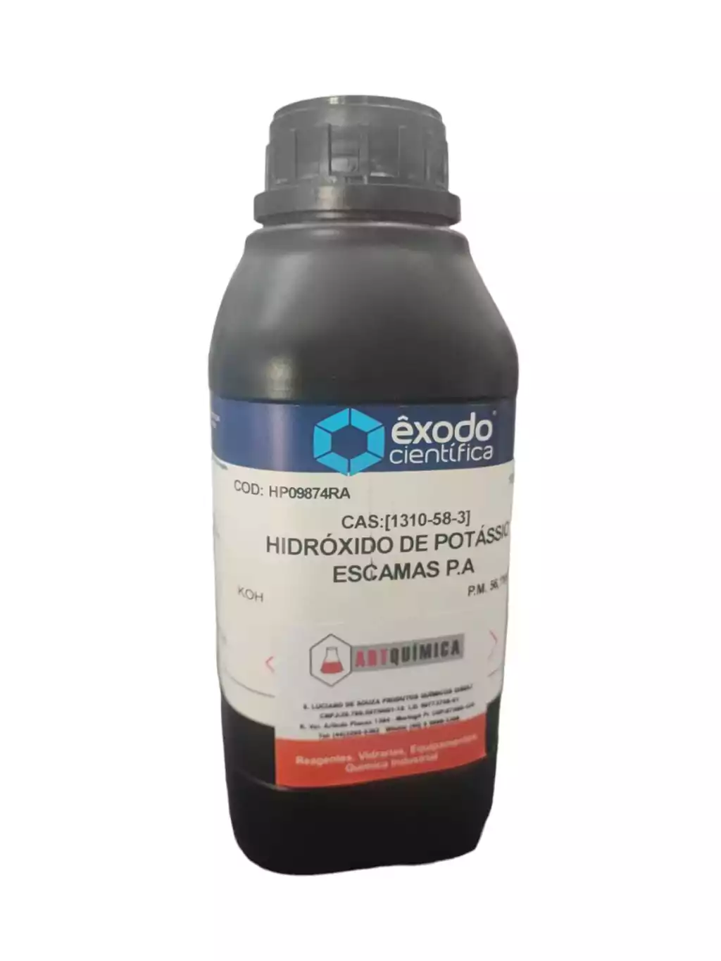 O composto químico hidróxido de potássio, também conhecido como potassa cáustica é um hidróxido cáustico que tem a seguinte fórmula química. Apresenta-se como um sólido branco, relativamente translúcido e em escamas finas praticamente incolor. Sua agregação está sempre em estado sólido.