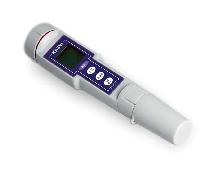 O Phmetro bolso Kasvi, é um medidor de pH portátil, pequeno o suficiente para caber no bolso. O eletrodo está alocado na ponta inferior da unidade com um pequeno display na parte superior.