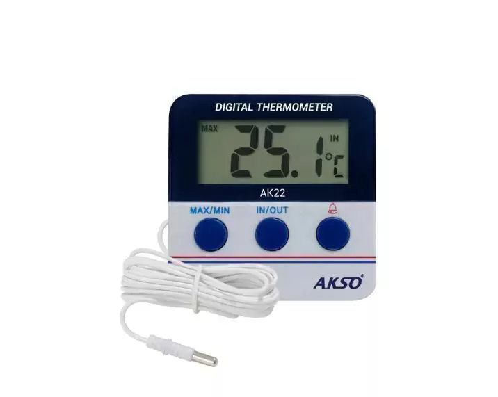 O Termômetro com Alarme AK22 é um simples e prático instrumento de medição de temperatura com escala de -50 a 70°C (sonda) e -20 a 70o (ambiente). Possui base magnética, que permite a fixação em superfícies metálicas, facilitando as medições. Com amplo visor de LCD, esse modelo possui registros de máxima e mínima e alarme configurável de temperatura alta e baixa para sonda externa.